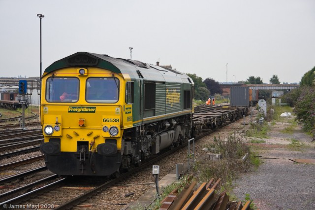 66538 slows for the crew change at Eastleigh, whilst working the 4E44 Millbrook to Leeds Freightliner