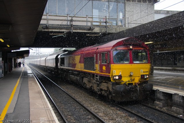 In a torrential downpour, 66009 speeds through Stafford with the 4F96 Ironbridge to Warrington Walton empty coal hoppers