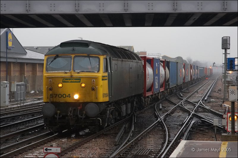 57004 'Freightliner Quality' heads the 4O27 liner from Trafford Park to Southampton through Eastleigh - 11th February 2005