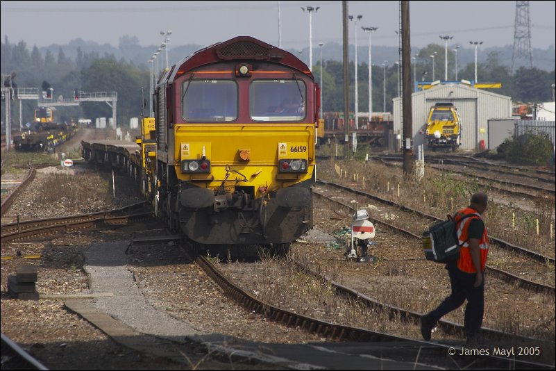 A Freightliner driver cautiously crosses the tracks, as 66159 shunts in Eastleigh Yard - 3rd September 2005
